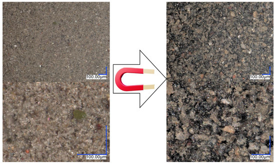 Microscopic images of sediment samples of fractions below 25 μm and particles separated using a magnet.