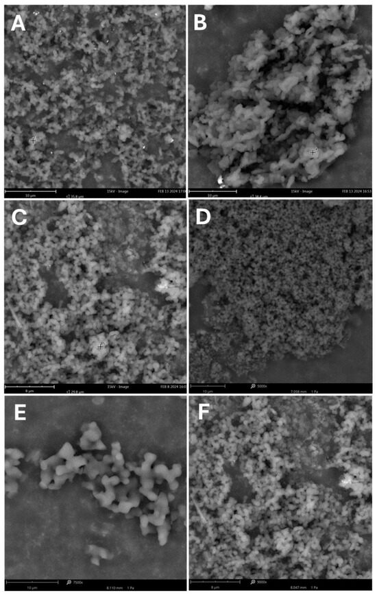 SEM images taken for extracts after washing with organic solvents: (A) UMU, (B) BIS, (C) BAT, (D) SZY, (E) CZT1, (F) DK11.