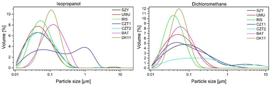 The particle size distribution obtained by extraction with isopropanol and dichloromethane is presented in Figure 7. The size of the majority of samples falls within the range of 0.01–0.5 µm for the isopropanol fraction and 0.01–0.3 µm for the dichloromethane fraction. Depending on the source of the material, particles of varying sizes are washed out. The extraction of sands with isopropanol (SZY, UMU, BIS) resulted in the acquisition of particles with sizes predominantly between 0.04 and 0.05 µm. However, when the starting material was snow, the sizes were CZT2 0.055 µm, CZT1 1.0 µm, and DK11 0.1 µm, respectively. Subsequent washing with dichloromethane leads to the extraction of smaller particles, with their sizes being more similar to each other.