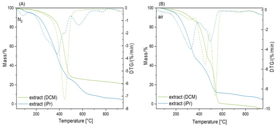 TGA results of extracts (A) in a nitrogen atmosphere, (B) in an air atmosphere.