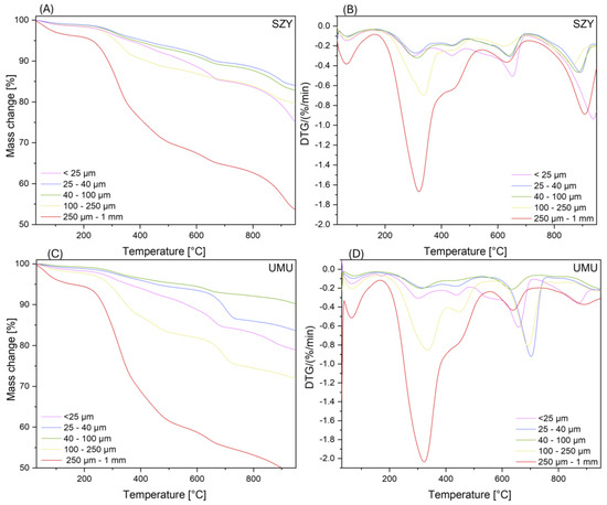 TGA results in a nitrogen atmosphere. For the SZY sample: (A) mass change, (B) DTG curve. For the UMU sample: (C) mass change, (D) DTG curve.