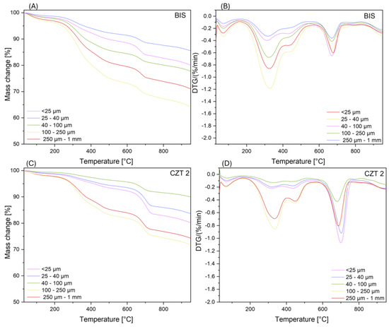 Figure 9 and Figure 10 present thermogravimetric curves for the SZY, UMU, BIS, and CZT2 sediments. A multi-stage decomposition is observed, which is a result of the complex nature of the samples in terms of their varied compositions, types, and collection locations (Table 6 and Table 7). The analysis of the SZY and UMU samples, collected as sand from areas near busy streets, shows similar degradation mechanisms (five-stage sample decomposition). The first stage of decomposition, in the temperature range of 30–150 °C, corresponds to the phase of dehydration and desorption of volatile substances. The next stage, occurring in the temperature range of 190–540 °C, is characterized by the presence of two peaks and is associated with the decomposition of organic matter, as well as remaining rubber particles that were not extracted due to their larger particle sizes. Samples with the largest grain fraction (250 µm–1 mm) show the highest percentage content of organic matter among the studied sediments. Above a temperature of 600 °C, the thermal decomposition of carbonates begins. The residual mass consists of inorganic residues, which occur in soils and car pollutants.