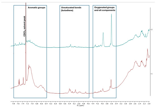 Furthermore, the region from 3 to 8 ppm can be divided into distinct signal groups: (a) 3.4–4.4 ppm from oxygenated groups and oil components; (b) 4.6–5.6 ppm from butadiene derivatives; (c) 6.4–7.8 ppm from aromatic groups.
