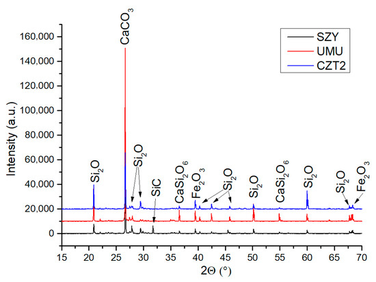 Figure 13 shows the XRD analysis of the selected samples. The XRD results of the UMU and CZT2 samples are similar. There are peaks from the same phases: Si2O, Fe2O3, and CaSi2O6. They differ only in the intensity of the peaks. In the sample SZY, in addition to peaks from Si2O, CaSi2O6, and Fe2O3, there is also a reflection from SiC. Similar results were presented in the work of Guleria et al. [47], which analyzed tire chips with other additives. The XRD analysis presented in the work of Guleria et al. shows that the tires contain the same compounds as in the results presented in this paper. Moreover, in the work of Amir et al. [48] XRD of rubber from recycled tires was also examined. In the results of Amir et al. the occurrence of CaCO3 and CaSi2O6 compounds in the tested tires was shown; these compounds also appear in the XRD reflections in this work.