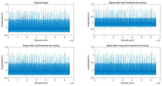 The basic idea of wavelet threshold denoising is to set a threshold value in advance. The signal is transformed by wavelet transform to obtain the wavelet analysis coefficient and compare it with the initial threshold. If the wavelet coefficient is less than the threshold, it is considered that the coefficient is mainly caused by noise, and it is removed to achieve the purpose of denoising. The wavelet threshold denoising method mainly includes wavelet soft threshold denoising and wavelet hard threshold denoising. The wavelet soft threshold denoising method can make the signal waveform smoother, but there are large signal distortion errors at the same time, which is very unfavorable to the signal feature analysis. Although there is a micro oscillation in the wavelet hard threshold denoising method, the signal obtained by its reconstruction can have a better approximation, be relatively more accurate, and have a small relative error. Therefore, the wavelet hard threshold method is adopted to conduct denoising processing, and the signal standard deviation is determined by the estimation method to determine the threshold value. The estimated threshold value is shown in Equation (3).