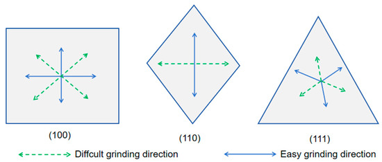 is the probability density, is the sampling value of the signal, is the average pulse, E(X) is the mean value, D(X) is the variance, α is the kurtosis, β is the skewness. For Poisson signals such as the acoustic emission signal in the diamond tool grinding process, both the mean value and variance are always , it is not effective in distinguishing signal samples [11,12,13]. Therefore, low-order statistics cannot reflect the directional state information of the tool grinding process. The literature [6] shows that the signal energy is mainly concentrated in the low frequency (0~2.50 kHz) and the high frequency (5.00~10.00 kHz). The spectral peak in the low-frequency band is basically located near the rotation frequency of the spindle and the frequency doubling of each order, which belongs to the deterministic signal. The energy distribution in the high-frequency band has obvious randomness and belongs to the random signal. Therefore, it is particularly important to extract the sub-signal of the high-frequency band (5.00~10.00 KHz) to calculate mean value, variance, skewness, and kurtosis in the time domain. The 100 surface of a single-crystal diamond is taken as an example. It can be seen from the crystallographic theory that this surface has 4-order symmetry, which is 4 non-difficult grinding directions and 4 difficult grinding directions. The angle relationship of the non-difficult grinding directions and the difficult grinding directions in 100, 110, 111 typical crystal surfaces are shown in Figure 2.