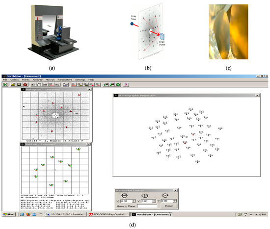 (a) Orientation instrument object, (b) Orientation instrument structure, (c) Single-crystal diamond tool, (d) Crystal direction figure.