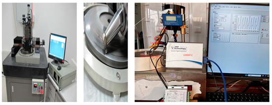 In this paper, the existing mechanical grinding machine tool in the laboratory is used for experimental research. The grinding machine tool adopts a vertical structure, and the X, Y, and Z three-axis table and main shaft are placed on the granite platform. The X, Y, and Z three-axis table is the superimposed layout; the tool pendulum shaft and its angle-adjusting mechanism are installed on the Z axis through the Z-direction guide rail. The grinding spindle realizes the planetary motion trajectory through the eccentric wheel, the tool is directly positioned on the tool pendulum shaft through the tool body, and the position adjustment of the tool when changing the angle and grinding is realized through the Z1 axis position adjustment mechanism. The Z2 axis feed mechanism realizes the micro-feed when the tool is grinding. The grinding machine includes a tool rest system, air float guide and micro-feed system, counterweight system, coordinate system, and planetary motion air float bearing grinding system. In order to study the online identification of tool grinding direction, a set of sound and vibration signal acquisition systems is set up. The acoustic emission sensor uses the SR-800 AE sensor produced by Beijing Shenghua Ltd. (Beijing, China), the vibration sensor uses the CA3007-100 sensor produced by Huishi Measurement and Control Ltd. (Shanghai, China), and the acoustic emission signal and vibration signal of the cutting tool during the grinding process are, respectively, collected. The AE sensor and vibration sensor are attached to the tool handle. After the sensor signals are processed by the amplifier and signal conditioner, they are collected by the data acquisition card to the computer for analysis and processing. The data acquisition card adopts a USB8812 high-precision acquisition card produced by Altai Ltd. (Shenzhen, China), and the upper computer interface is realized by LABVIEW2020 software. The collected acoustic emission signals and vibration signals are converted into digital signals by the data acquisition card and sent to the industrial computer; the experimental platform is shown in Figure 5.