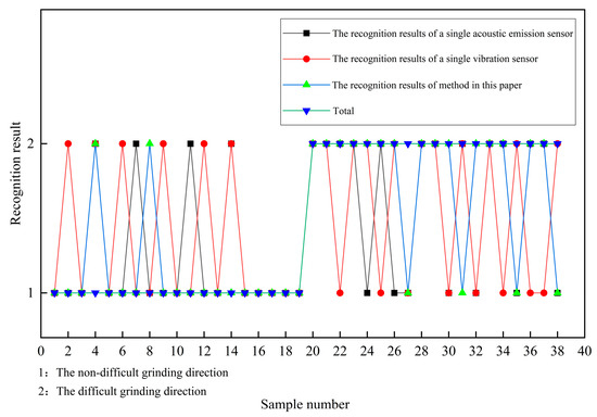 Then, the last 19 groups of samples of each direction type are used as test samples, and the time domain characteristic parameters, namely peak value and skewness, are calculated, respectively, for each group of vibration signals to form a 2 × 19 feature vector sequence, the time domain characteristic parameters, namely peak value, are calculated for each group of sound signals to form a 1 × 19 feature vector sequence. The above 19 groups of 3 × 19 feature vector sequences are used as test samples to input the above-trained HMM model in the difficult grinding direction and the non-difficult grinding direction. The maximum likelihood probability corresponding to the output of the two HMM models is calculated. The orientation type of the model with a high output probability value is regarded as the orientation type of the current grinding tool. The identification of a single acoustic emission sensor and a single vibration sensor are compared with the method in this paper.