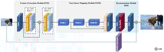 As shown in Figure 1, our proposed FSANet consists of the Feature Extraction Module (FEM), Non-Linear Mapping Module (NMM), and Reconstruction Module (RM). We use I L R , I S R , and I H R to denote the input, output, and high-resolution image of FSANet, respectively. In the FEM, I L R is first passed through a convolution layer for feature extraction. The output g c o n v is then processed by two Res ASPP Modules, each of which contains three parallel deep CNNs to expand the receptive field and obtain multi-scale features.
