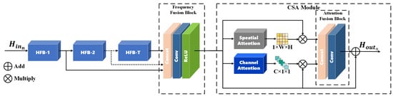 As illustrated in Figure 3, the HFAB primarily comprises three components: a linear stack of High-Frequency Blocks (HFBs), a Frequency Fusion Block, and a CSA Module. Let the input of the t-th HFB be F H F B t 1 and the output be F H F B t . Thus, the t-th HFB can be defined as follows: