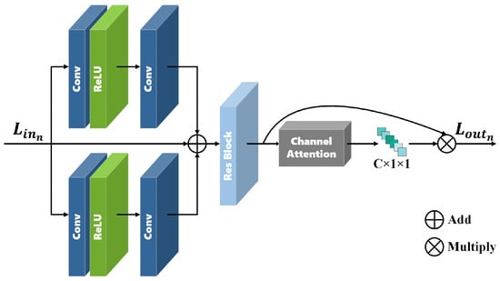 We utilize the Low-Frequency Attention Block (LFAB) to process low-frequency features, employing a tri-branch structure for handling the low-frequency features L i n n , as illustrated in Figure 5. One branch retains the original input information, corresponding to the middle branch in Figure 5. Another branch utilizes a deep CNN and a convolutional layer with a kernel size of 3 × 3 , depicted as the top branch in Figure 5. The final branch comprises a deep CNN and a convolutional layer with a kernel size of 5 × 5 to expand the field of view, shown as the bottom branch in Figure 5. To mitigate the impact of increased network depth on feature attenuation and selective enhancement across different channels, we perform an additive operation on the three branches before passing the result through a residual block and a channel attention mechanism to obtain the output L o u t n of the t-th LFAB,