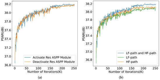 Figure 7b displays the PSNR results of the three experiments tested on the Set5 dataset during the training process, and Table 2 shows the test results of the three experiments on standard datasets. We found that using both the LF path and HF path for image reconstruction yielded better results and faster convergence than using either path alone.