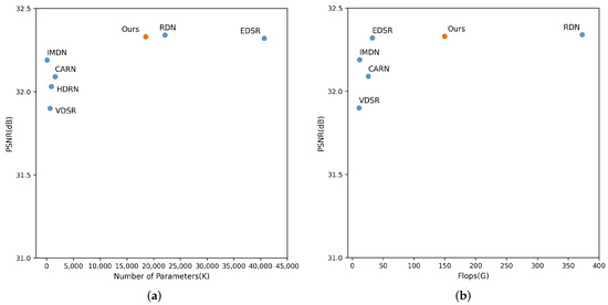 As illustrated in Figure 12a, we compared the super-resolution performance and parameter count of our FSANet at a magnification factor of ×2 with existing models, namely, VDSR [6], HDRN [48], CARN [49], IMDN [50], RDN [16], and EDSR [12]. Our network performs comparably to EDSR [12] and RDN [16], yet it requires significantly fewer parameters than EDSR [12] and slightly fewer than RDN [16]. Equally important is the computational complexity. Our proposed FSANet for a scale factor of 2 has a computational burden of 150G Flops. We compared this computational burden with that of other methods and plot the results in Figure 12b. On the x-axis of Figure 12b, we represent the computational burden, while on the y-axis, we depict the performance on the benchmark dataset BSD100. As shown in Figure 12b, although our performance is slightly weaker than that of RDN [16], our computational complexity is significantly lower than that of RDN [16].