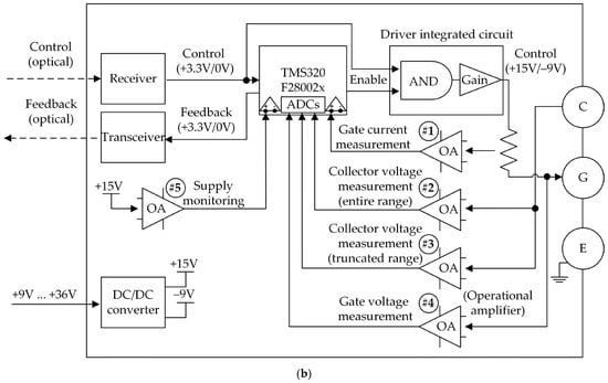 The driver is shown in Figure 1a. The input power supply is generated by a DC/DC converter with a wide input voltage range of 9 to 36 V DC. It has galvanic insulation of 6000 V and provides power to all the circuits of the driver PCB. The driver has two optical communication channels for exchanging information with the upper-level control system. The first channel is the input, used to receive the transistor control signal, which is converted into a voltage of +15 V/–9 V that is supplied to the IGBT gate. The second optical channel is the output and serves as feedback. The feedback signal generates pulses of varying duration to inform the control system about the correct operation of the transistor or about a fault. The board has three power pins for connecting the collector, gate, and emitter of the IGBT. For analyzing transient processes in the IGBT, the internal analog-to-digital converter (ADC) of the microcontroller is used. Operational amplifiers (OAs) are used to implement the necessary gains in each channel. Thus, the TMS320F28002x microcontroller measures the values of gate current, gate voltage, and collector voltage and monitors voltage supply. Moreover, two collector voltage measurement circuits are implemented. Circuit #2 (see Figure 1b) makes it possible to control the entire collector voltage in the entire range of 0 to 1300 V, and circuit #3 (see Figure 1b) operates in a truncated range of 0 V to 15 V for a more accurate measurement of the desaturation of the transistor in its conducting state. A functional diagram of the driver is shown in Figure 1b.