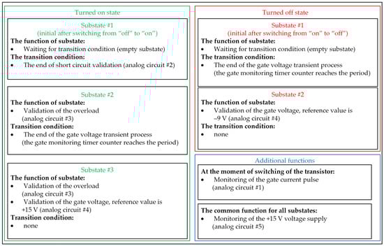 If the acceptable value is exceeded, the control signal is blocked, and a feedback pulse with a duration of 9 μs is generated, as shown in Figure 2d. If the voltage value is within acceptable limits, then initial substate #1 of the finite-state machine is changed into substate #2 of the “on” state, as shown in Figure 3 and Figure 4. The purpose of substate #2 is to verify the collector voltage measured by analog circuit #3 (see Figure 1) with a reduced range of 0 V to +15 V. This analog circuit is used when the transient process of the collector voltage is finished and the IGBT is switched on completely.