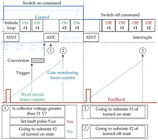 The main structure of the software is implemented by a finite-state machine. The finite-state machine has two states, “on” and “off”, which correspond to the on and off states of the IGBT control signal. Also, each state has substates with functions that correspondingly monitor the measured values. The functions and transition conditions of the finite-state machine are shown in Figure 3. In all substates, the voltage supply, +15 V, is monitored. The transition to the next substate is triggered by the corresponding hardware timers of the microcontroller. These timers are normally used as carrier signals to implement pulse-width modulation (PWM) when controlling a power electronic converter. In this case, the timers are synchronized with the falling and rising edges of the input optical control signal. The operation of the substate functions can be interrupted by corresponding events.