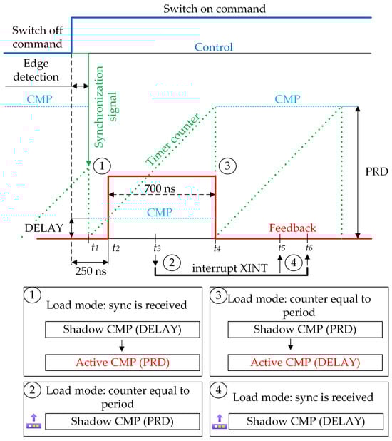 The algorithm for the generation of the feedback pulses is based on the utilization of the PWM module of the microcontroller. Timing diagrams of the PWM module’s operation are shown in Figure 5. This peripheral device provides a quick response to the edge of the control signal and determines pulses of the required duration. If the edge of the control signal appears, an internal synchronization signal is generated after a delay. This delay is associated with the filtering of the input discrete signal by the microcontroller. This synchronization signal forces the PWM module to reset the timer counter and load values from the shadow counter-compare (CMP) register to the active CMP register. If the timer counter is less than the CMP value, then the feedback signal is in a low state; otherwise, the feedback is in a high state within the time interval from t2 to t4, equal to 700 ns. At the instance of time t1, the synchronization signal appears, and the value equal to “DELAY” stored in the shadow register is loaded into the active CMP register. The CMP value “DELAY” corresponds to the time necessary to provide a delay in the feedback pulse equal to 250 ns. The XINT interrupt occurs at the instance of time t3 and is triggered by the edge of the control signal. The algorithm of this interrupt function changes the condition of the loading values from the shadow CMP register to the active CMP register. The “PRD” value, which is equal to the period value of the counter, is loaded into the shadow register CMP. Thus, the new loading of the CMP occurs at time t4 when the PWM counter reaches the value “PRD”. At this moment, the feedback signal state changes from a high to a low state because the CMP value becomes unattainable for the timer counter. At the end of the XINT interrupt, at time t5, the CMP shadow register is loaded with the value “DELAY”, and the loading from the shadow CMP register to the active CMP register is configured by the synchronization signal again. After exiting the XINT interrupt at time t6, the PWM module is ready to set a pulse again.