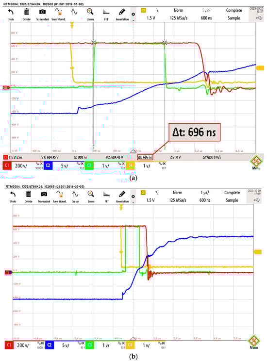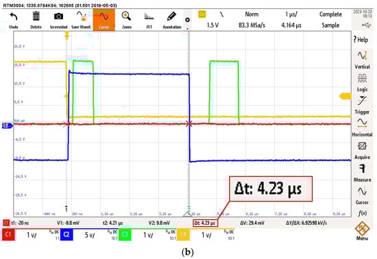 Transient signals of the gate driver in normal operation mode: yellow—control signal; blue—gate voltage; red—collector–emitter voltage; green—driver feedback signal. (a) Enlarged picture. (b) Narrowed picture.