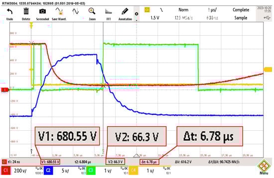 A short circuit is imitated using the test bench. The collector voltage is increased by means of disconnecting relay K1. During the turn-on phase, the voltage drop across resistor R1 is equivalent to the fault operation mode of the IGBT with a short circuit. The transient signals in the short-circuit operation mode are shown in Figure 8. As shown in the oscillograms, at the instance in time of 6.78 µs after the appearance of the edge of the control signal, a feedback pulse with a duration of 9 µs is produced. The transistor is switched off, and a fault pulse is generated because the voltage across the collector is greater than 51 V and equal to 66.3 V at that instance in time (see cursor 2 in Figure 8). The driver blocks the control signal to the IGBT, and the gate voltage begins to decrease from +15 V to –9 V. The transistor goes into the switched-off state, and the collector voltage increases.