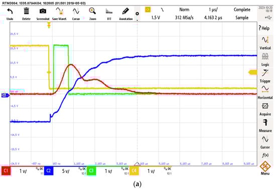(a) Transient signals of the gate driver in normal operation mode. (b) Transient signals of the gate driver in the case of disconnecting the driver pin from the gate of the transistor: yellow—control signal; blue—driver output gate voltage; red—gate current; green—driver feedback signal.