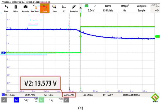 The IGBT driver has an input DC/DC converter, which supplies its circuits. The permitted range of the input voltage is from 9 to 36 V DC. The voltage supply +15 V fault voltage is simulated in the testbench by inserting serial resistor R4 into the supply chain and switching off relay K4 (see Figure 6). Transient processes are shown in Figure 10a,b. The moment at which the voltage supply decreases is shown in Figure 10a. The voltage goes out of the acceptable range, and the driver’s feedback signal changes from a low state to a high state, which corresponds to a voltage supply failure. The processes of establishing the voltage supply, +15 V, within the acceptable range of values and resetting the driver fault are shown in Figure 10b. The control circuit supply of the IGBT driver has some energy stored in its filtering capacitors and can withstand the turning off of the input DC/DC converter during the test.