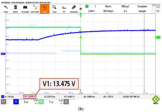 (a) The driver feedback signal sets the fault in the case of a voltage supply, +15 V, that is out of range: blue—supply voltage; green—driver feedback signal. (b) The process of establishing the voltage supply, +15 V, and resetting the driver fault: blue—supply voltage; green—driver feedback signal.
