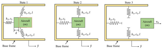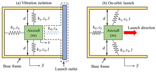 Figure 1b shows the spacecraft’s in-orbit launch design for in-orbit launch. When the launch outlet is open, the spacecraft is supported by the two pre-stretched vertical springs and and the pre-compressed transverse spring . The vertical springs and produce negative stiffness to enhance launch speed. As shown in Figure 2, first, in the initial state (State 1), the spacecraft is prepared for release and then disconnects from these three springs when it moves to the position of State 2. Finally, the spacecraft leaves the base frame (the in-orbit launch system) with an initial velocity .