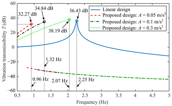The vibration transmissibility of the linear design and the proposed design with different excitation amplitudes .