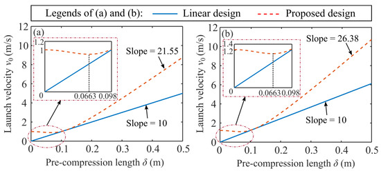The launch velocity curve versus pre-compression length of the linear design and the proposed design with (a) parameter set 1 and (b) parameter set 2.