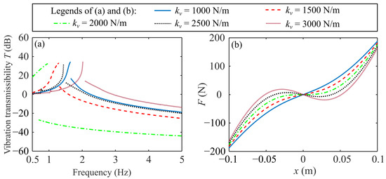(a) The vibration transmissibility and (b) the nonlinear restoring force with different of the proposed design.