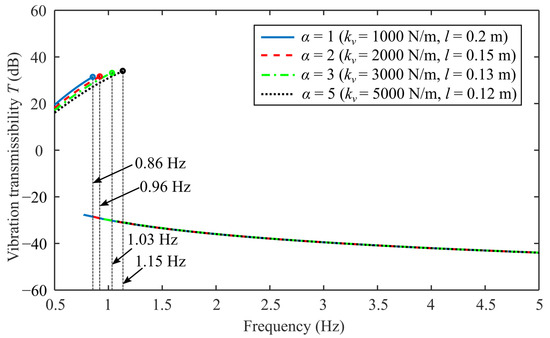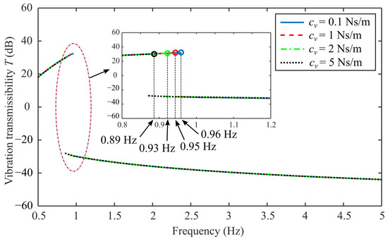Finally, the effect of vertical spring damping on vibration isolation performance is discussed. Figure 7 shows the vibration transmissibility curve under a different , and the values of other parameters are the same as those shown in Table 1. The base excitation amplitude is . Results show that the damping coefficient has little influence on vibration isolation performance. With the increase of damping , the peak frequency only decreases slightly, and the peak amplitude also decreases slightly. Compared with the influence of stiffness , the influence of damping can be ignored.