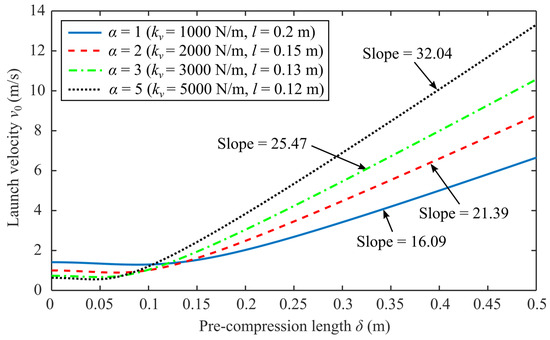 The launch velocity curve versus pre-compression length with different (configurations of and ) of the proposed design.