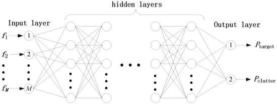 Output layer: The number of nodes in the output layer is generally set to 2, corresponding to the probabilities of being the target and clutter, respectively. Using to represent the probability that the radar point is the target, and to represent the probability of clutter, they satisfy the relationship .