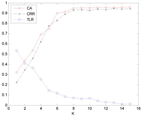 The CA, CRR and TLR of RPC-EAU based on different K values.