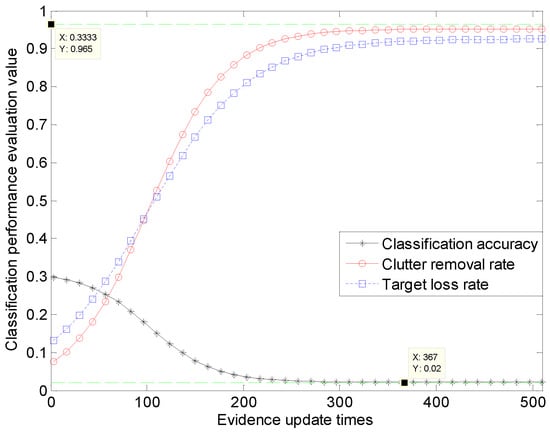 As show in Figure 9, the classification accuracy and clutter removal rate of RPC-EAU gradually increase with the increase in the evidence update times. Especially when the evidence update times increases from 1 to 300, they can increase from around 0.1 to 0.9. The target loss rate gradually decreases as the evidence update time increases, from the initial 0.3 to around 0.02. It can be seen that once the classification accuracy, clutter removal rate and target loss rate of RPC-EAU reach a certain level, they will not significantly improve with the increase in evidence update times. As shown in Figure 9, the classification accuracy and the clutter removal rate are always below 0.966, while the target loss rate cannot be lower than 0.02. Table 9 indicates that CPU time is generally proportional to the evidence update times. So, when the evidence update times exceed 400 in this experiment, the classification performance no longer significantly improves. Increasing the number of updates at this point will only waste more CPU time.