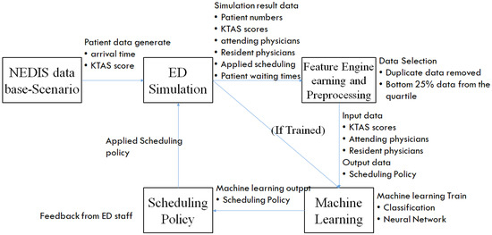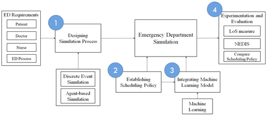 This research aims to develop a real-time resource utilization scheduling method based on admissions, patient, and physician information within the ED environment, and to build a simulation model that is applicable to various studies. The objectives include: developing an ED simulation using DES, providing six scheduling policies based on physician experience, and employing machine learning to select the most appropriate scheduling policy. This study aims to develop a generic simulation model that can be applied not just to specific hospitals but across various reusable systems [24]. Using comprehensive ED visit data from the Korean National Emergency Department Information System (NEDIS), we design and conduct experiments to validate our model, ultimately facilitating optimal scheduling policy that improves the LoS.