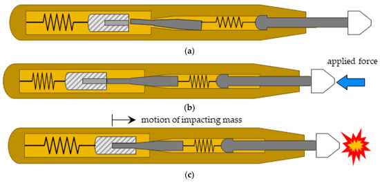 Schematic cross-section of the mechanical IG showing the principles of operation. (a) Uncompressed position of the IG. (b) Compression of IF as force is applied to the tip. (c) Actuation of the IG causing impulse at the tip.