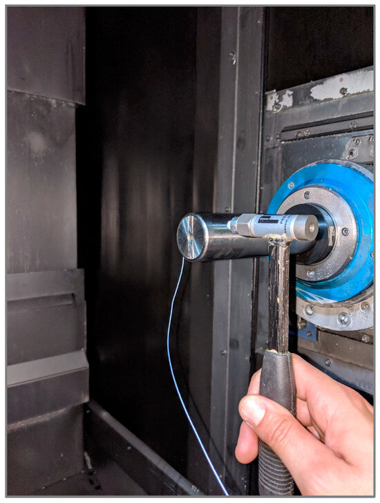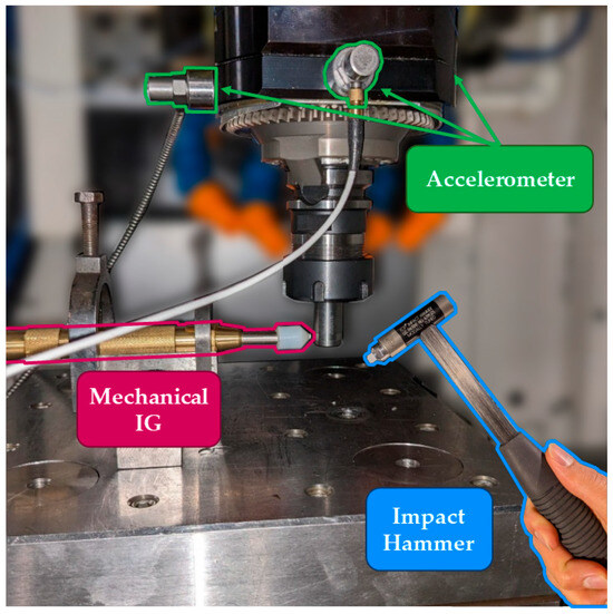 The forces from the IG were compared against a conventional PCB Piezotronics 086C01 impulse hammer (Depew, NY, USA). Spindle vibrations were measured with accelerometers at three locations on static locations of the spindle housing. Two Kistler 8702B K-Shear-type single axis accelerometers (Mississauga, ON, Canada) were mounted at the static part of the spindle housing to record accelerations in the machine +x and +y directions. A redundant third PCB Piezotronics 352A21 (Depew, NY, USA) single-axis accelerometer was also included to measure accelerations in the machine −x direction for verification and error checking. Data acquisition was performed by a National Instruments NI-9234 data acquisition card at a sampling frequency of 51,200 Hz. Finally, the saved time-series data was exported to MATLAB R2023b for experimental modal analysis.