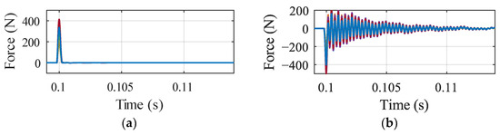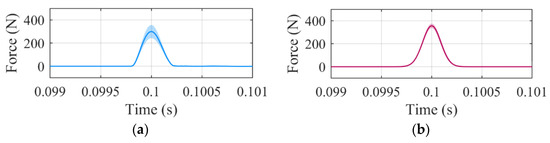 Maximum variation in the input force magnitudes over 50 trials: (a) conventional hammer; (b) mechanical IG device. The solid line indicates the average force across 50 trials, while the shaded region indicates one standard deviation of the force values over the 50 trials.