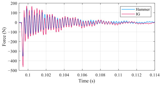Figure 9 shows a comparison of the impulses from the conventional hammer and the fitted impulses of the IG across 50 trials each. The shaded regions in Figure 9 indicate the maximum range of the results recorded in the 50 trials. An advantage of the IG is observed in the reliable impact force produced by the mechanical device. A comparison of the two methods indicates that the IG produced a more consistent impact force compared to the conventional hammer. Since the results from the initial characterization of the IG were consistent, the input force profile of the IG was assumed to be constant in the following analysis, and the force plate measurements were not needed for FRF estimation. Impacts of this assumption are discussed further in Section 4.1.