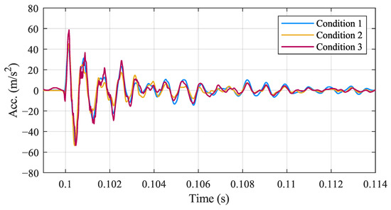 The average time-series accelerometer data from the −x axis accelerometer is shown in Figure 10 for 50 tap test trials under each of the three static test conditions. The acceleration profiles displayed strong agreement across the static test conditions.