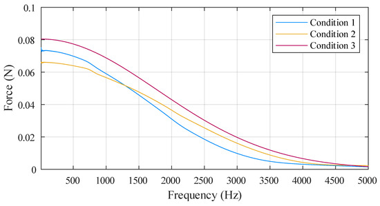 Comparison of the average input force spectrum recorded from 50 trials for each of the three static spindle test conditions.
