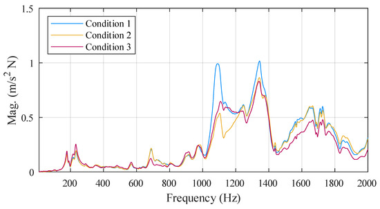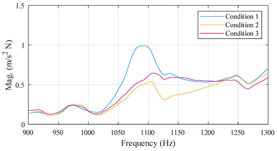 The magnitude plot for the three FRFs is shown in Figure 13. Close agreement is observed in the FRFs calculated for each of the three conditions in the first half of the frequency range up to 1000 Hz. Beyond this range, the results show some minor deviations in magnitude, with similar overall trends. The FRF peak at 1080 Hz displayed the most notable difference among the tests. The freely vibrating tool of Condition 1 displayed a high magnitude peak at this frequency, while the tool–IG contact found in Condition 2 and Condition 3 displayed a notably lower magnitude. However, Condition 2 and Condition 3 both show good agreement with one another, which suggests that the tool–IG contact is the cause of this difference and not the method of applying the force. Further discussion on the effect of this contact is found in Section 4 of this article.