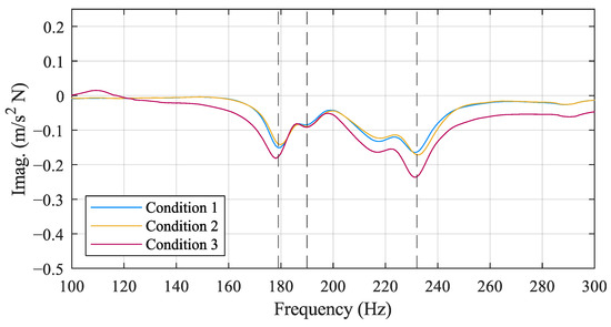 The real and imaginary components of the FRFs were considered to determine modal characteristics of the static spindle. A detailed view of the real and imaginary components of the FRF between 100 and 300 Hz is shown in Figure 14 and Figure 15, respectively. The peak picking method was used to identify the modal characteristics at 180, 190, and 230 Hz to illustrate the capability for the tracking of spindle dynamics. Table 1 summarizes the characteristics for the three modes calculated using Equations (7)–(9). Close agreement was observed across the three conditions, with the largest differences observed in the stiffness parameters for the three modes. These results demonstrate the capacity of the proposed system to accurately track the modal characteristics of a machine tool spindle unit with comparable accuracy to the conventional impact hammer test.
