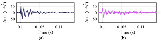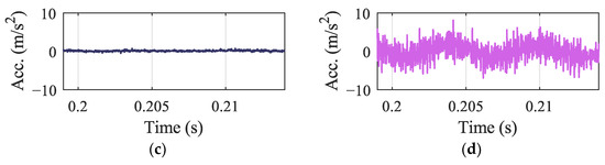 Comparison of the acceleration response of a single trial for the static and dynamic spindles: (a) during the impulse from the IG at 0 RPM; (b) during the impulse from the IG at 10,000 RPM; (c) after the vibration decay at 0 RPM; (d) after the vibration decay at 10,000 RPM.