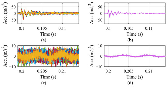 Illustration of the averaging method for noise reduction at 10,000 RPM: (a) acceleration response signal for 50 trials during an impulse from the IG; (b) average of 50 trials, which retains the overall shape of the responses; (c) acceleration response signal for 50 trials; (d) average of 50 trials showing a reduced signal noise. Each colored line in the chart depicts an individual impact trial, while the pink color is reserved for the averaged value.