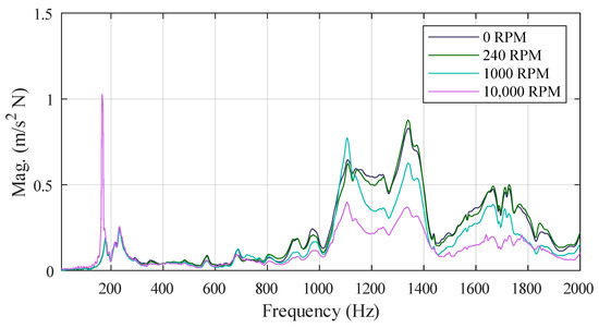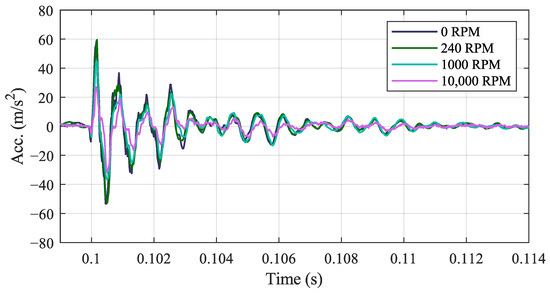 The dynamic spindle test presented additional challenges due to the vibrations produced by the rotating spindle. The x axis vibration time-series of a single trial of the 0 RPM and 10,000 RPM test immediately at impact from the IG are shown in Figure 16a,b for comparison. At high speed, a harmonic oscillation corresponding to the spindle rotational speed was observed in the acceleration signal. After the vibration response from the IG decayed, the harmonic component remained in the acceleration signal, as observed in Figure 16c,d, which displays a detailed view of the same signals 0.1 s later. Averaging the acceleration signal from 50 trials had a significant reduction on this noise, while retaining the characteristic response from the input of the IG. The averaging approach is illustrated in Figure 17 for the 10,000 RPM trial. Figure 18 shows a comparison of the average accelerometer signal collected from all 50 impact tests performed at each of the spindle speeds. The results are similar to the static spindle tests; however, the magnitude of the vibration response tended to decrease as the spindle speed increased. A discussion of the spindle speed effect on the vibration dynamics can be found in Section 4.5. The FRF was calculated for each trial for an in-depth investigation.