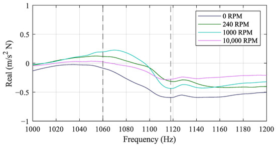 Detailed view of the real components of the FRF for each of the three static spindle test conditions. Dashed lines indicate critical features for modal characterization.