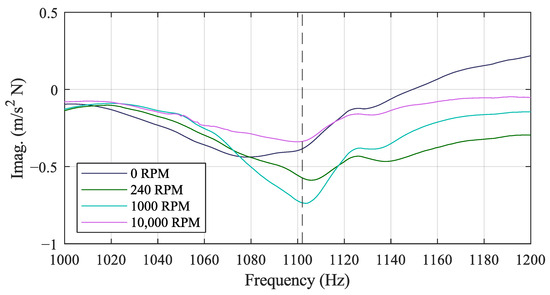 Detailed view of the imaginary components of the FRF for each of the three static spindle test conditions. Dashed lines indicate critical features for modal characterization.